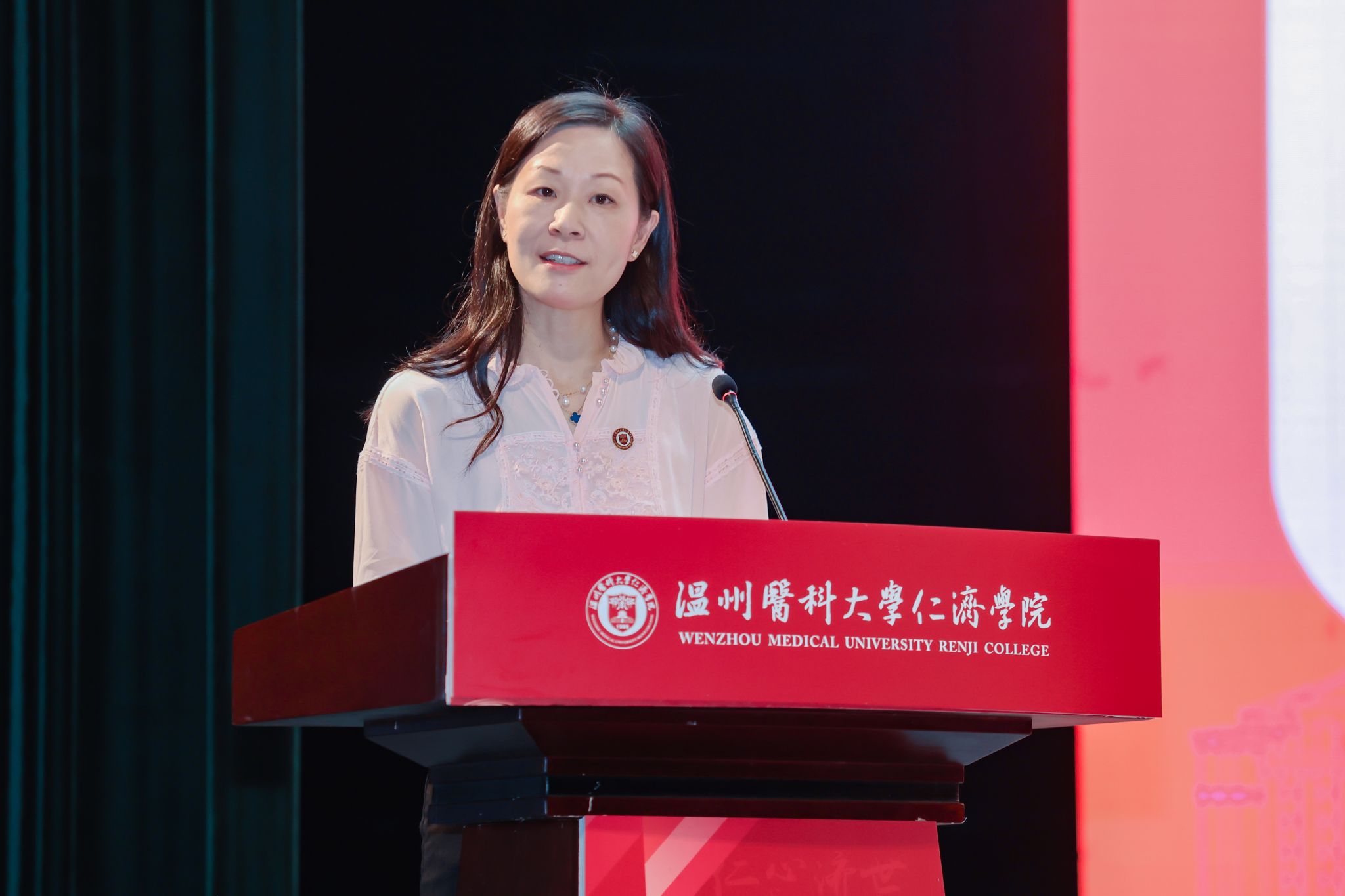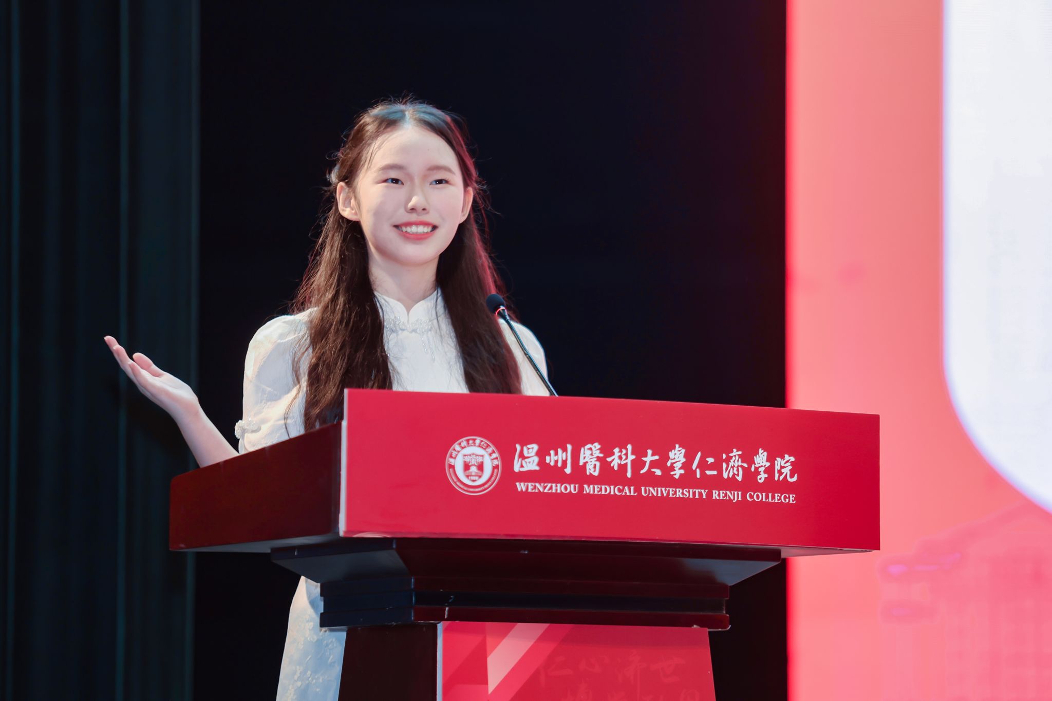 2022级公共事业管理专业学生胡佳祺作为高年级学生代表上台发言,她以过去两年自身多次试错和挑战的经历为例,谈论对“仁心济世,博学致用”院训精神的深刻理解,鼓励新生们要学会认识自己,积极参与学术和实践活动,不断提升综合素养,创造自身价值,切实将院训作为内化于心、外化于行的行动指南。