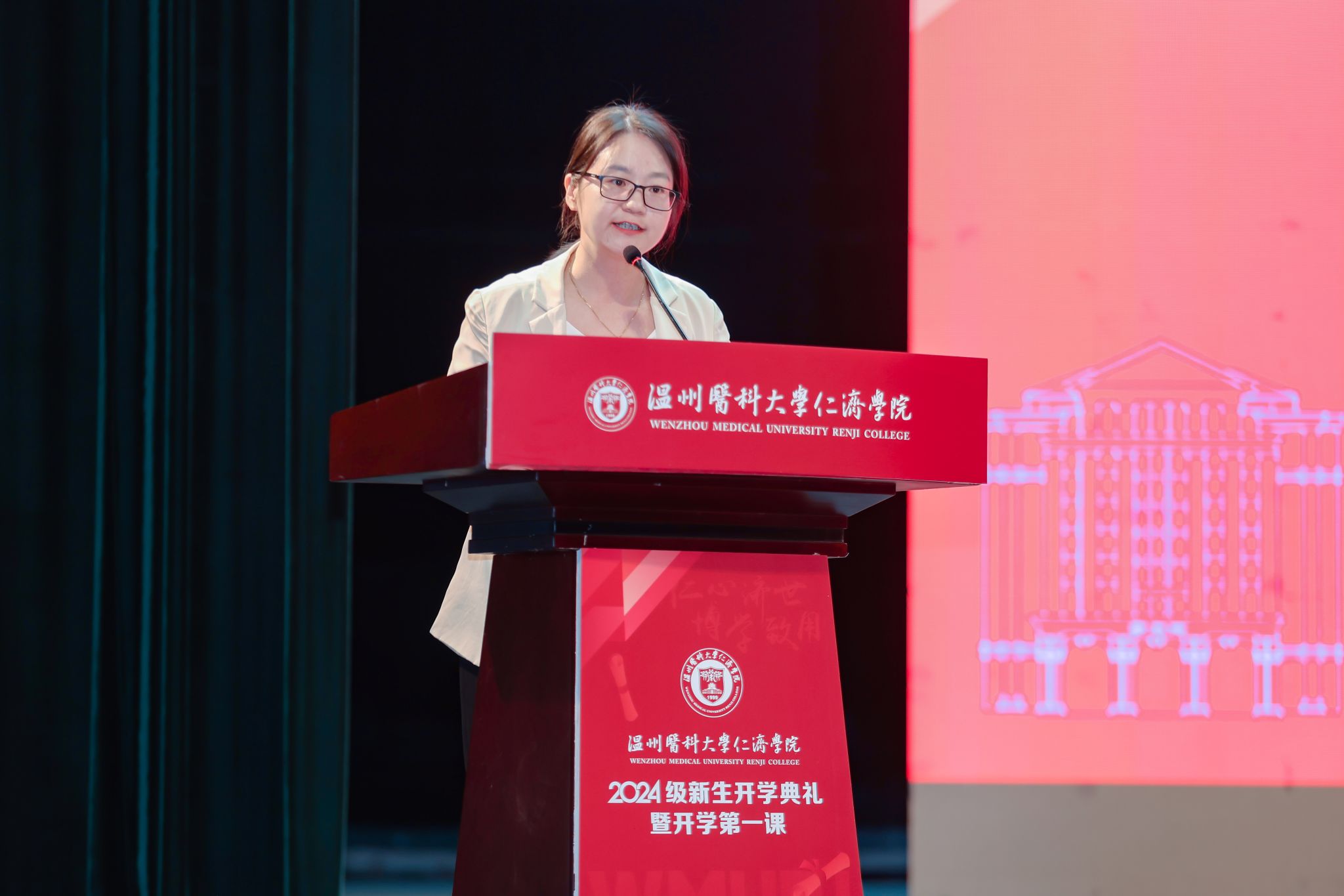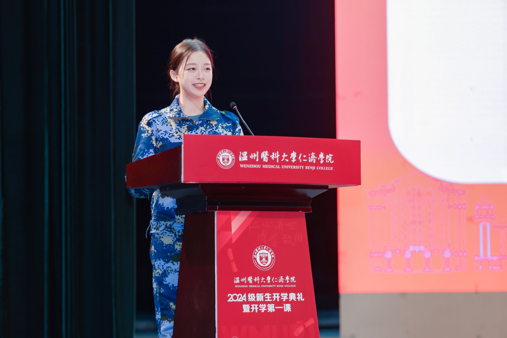 2024级临床专业学生杨涵笑作为新生代表呼吁所有同学要经常自我反思,不断切换学习方式,学会用各种信息丰富自己,沿着医者的足迹,无畏地前行。接着,并带领全体同学庄严宣誓。