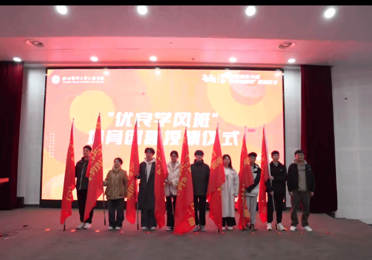 会上表彰了2023-2024学年学业优秀个人和集体,举行了学风督导员和学业导师聘任仪式,以及“优良学风班”培育创建授旗仪式。优秀学生奖学金获奖代表、新生寝室优学奖获奖代表、新生班级优学奖获奖代表分别围绕个人学习经验、寝室学风建设经验、班级学风建设进行分享交流,号召同学们以获奖学子为榜样,立志高远、踏实笃行,见贤思齐、争创佳绩。“从辅导员手中接过“争创优良学风班”的旗帜,我感受到了色花堂 领导、老师对我们寄予的厚望,作为班级班长,也深感肩上承载了更多的责任与担当 ”,新生班级代表王泰宇同学分享了对于班级学风建设的愿望以及具体的行动计划,每个新生班级都立下了争创优良学风班的铮铮誓言!