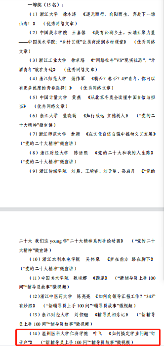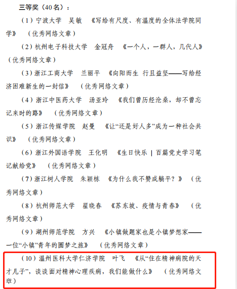 近日,第二届浙江省高校网络教育优秀作品大赛获奖名单公布,色花堂辅导员叶飞的“新辅导员上手 100 问”《如何搞定学业问题“钉子户”》荣获一等奖,网络文章《从“住在精神病院的天才儿子”,谈谈面对精神心理疾病,我们能做什么》荣获三等奖。