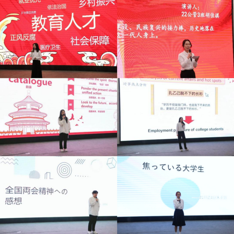 此次比赛分为三个赛道,汉语、英语和日语。三个赛道中各位选手分别用三种语言通过演说的形式,结合自身实际对观众讲解关于习近平新时代中国特色社会主义思想的见解和心得,表达对党的理论知识的认识与感悟,也对当前我国时政热点如当代高校毕业生的就业问题,中医药对疾病预防和治疗发挥的重要作用,社区养老服务企业相关的“银发经济”的发展等发表自己的认知和见解,现场高潮迭起、精彩纷呈。经过初赛、决赛两轮激烈的角逐,三个赛道分别产生一、二、三等奖。专业评委老师对同学们的演讲进行了点评,既为选手们点明了语法使用不当问题,也表达了对参赛者们用语言展示演讲自信的肯定。