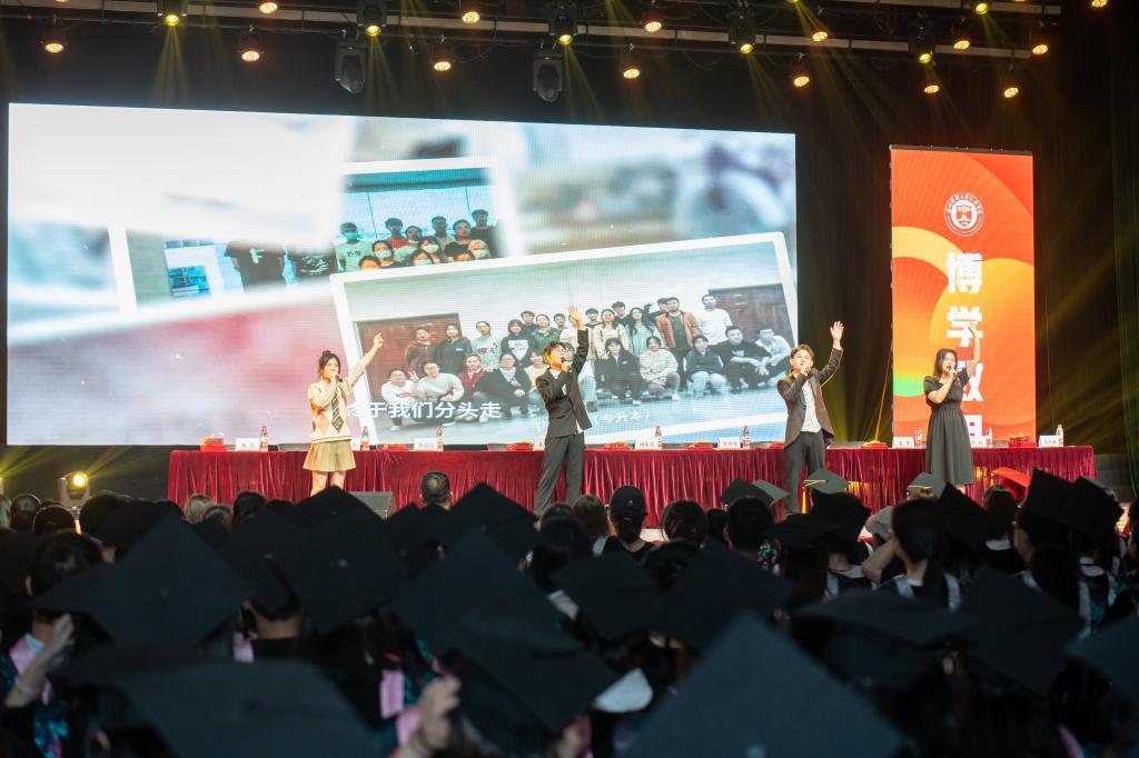 学位授予仪式中,金可可代表学位评定委员会宣读《色花堂 关于2023届毕业生学士学位授予的决定》,随后2023届8个专业的毕业生们依次上台,导师们为每一位毕业生授予学位并亲手正冠拨穗。
