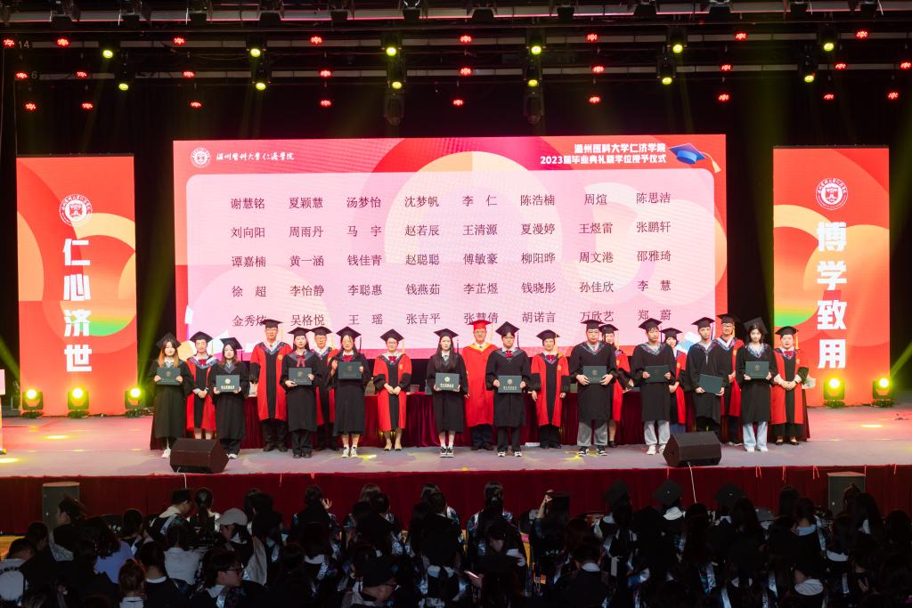 典礼上,对荣获浙江省高校优秀毕业生称号、校优秀毕业生称号和考研卓越奖的优秀学子进行表彰,各位导师为荣誉获得者代表颁发荣誉证书并合影,同时为校友联络员颁发聘书。毕业生代表们也为默默付出、诲人不倦的导师代表鲜花致礼,表达内心最诚挚的感恩与敬意。
