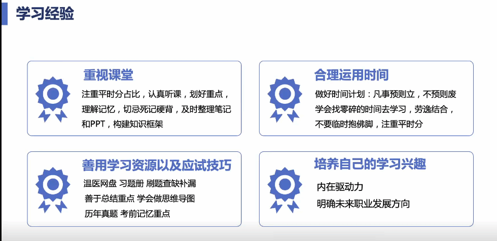 在学习方面,来自20级康复治疗学专业的冯雪儿着重传授了考试周的提分方法,提出以“复习历年大题”、“刷完配套复习题”、“结合学长学姐和自己的笔记”三大点为轴,以各大公众号和网络资料为齿轮,运转复习这台庞大的机器。21级助产专业的谢柯颖把学习重点归纳为“重视课堂”、“规划时间”、“利用资源”、“培养兴趣”四个方面,勉励同学藉此提高效率、激发学习的内在驱动力。20级医学检验技术专业的王智凌提出了保持学习动力的方法——劳逸结合,既要努力拼搏,也要给自己一片宁静的天空,让“烟火味”给自己“充充电”。20级英语专业的沈相彤同学提供了最为详细的英语学习技巧,指出听力部分要循序渐进,阅读部分要积累词汇,写作和翻译要尊重原文,并分享了独家记词法。