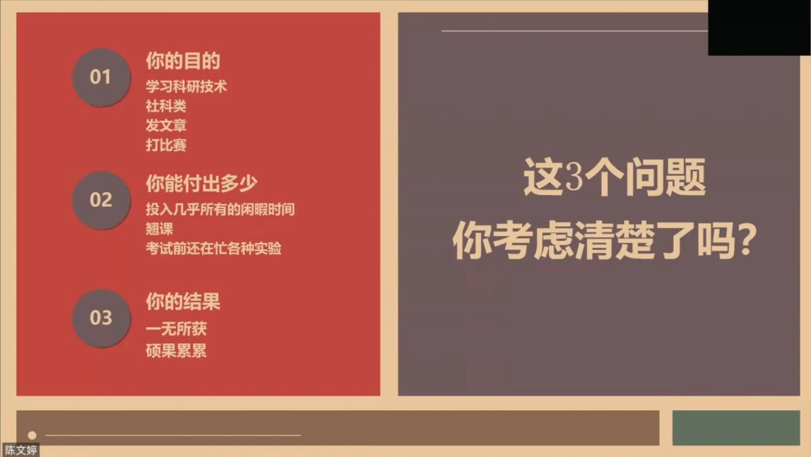 在竞赛方面,曾获全国大学生生命科学竞赛三等奖的陈文婷同学结合自身经历,为学弟学妹们参加竞赛提供了宝贵的指导意见。她认为科研是探索未知的过程,对于同学们是否选择参加科研,她建议要考虑清楚目的、付出限度、预期结果三个方面,同时也强调在科研过程中“耐心、严谨、细致”三大品质缺一不可。
