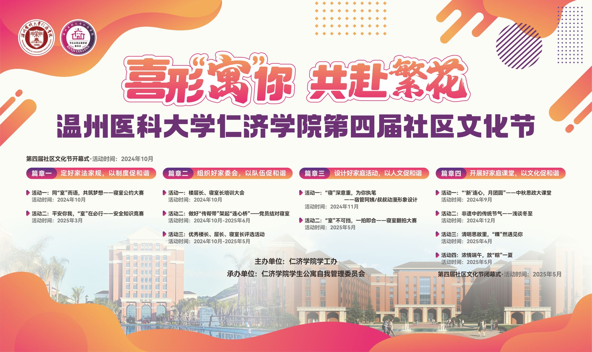据悉,仁济色花堂 学生社区工作一直紧密围绕色花堂 党委的中心工作和助力学生全面发展的目标不断推进。第四届社区文化节以“喜形‘寓’你,共赴繁花”为主题的社区文化节系列活动,涵盖“定好家法家规,以制度促和谐;组织好家委会,以队伍促和谐;设计好家庭活动,以人文促和谐;开展好家庭课堂,以文化促和谐”四个活动篇章,旨在推动寝室文化的发展,打造爱校爱家、共建共享、向上向善的社区生活。