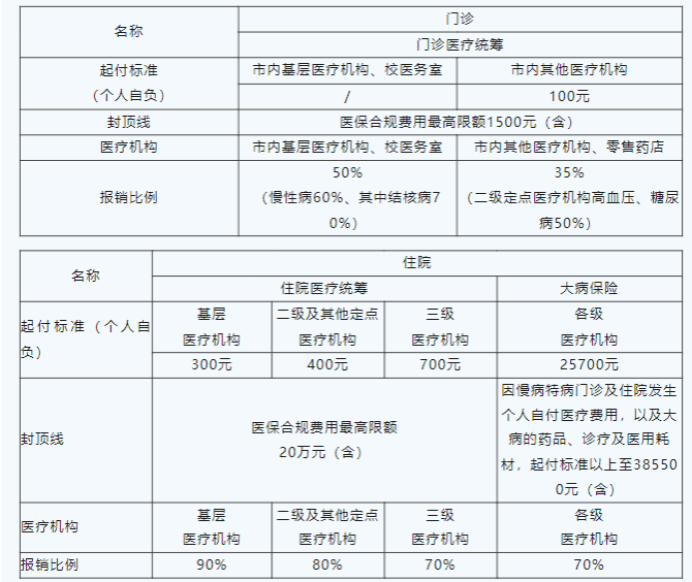 起付标准 (个人自负) | 市内基层医疗机构、校医务室 | 市内 其他医疗机构 |
