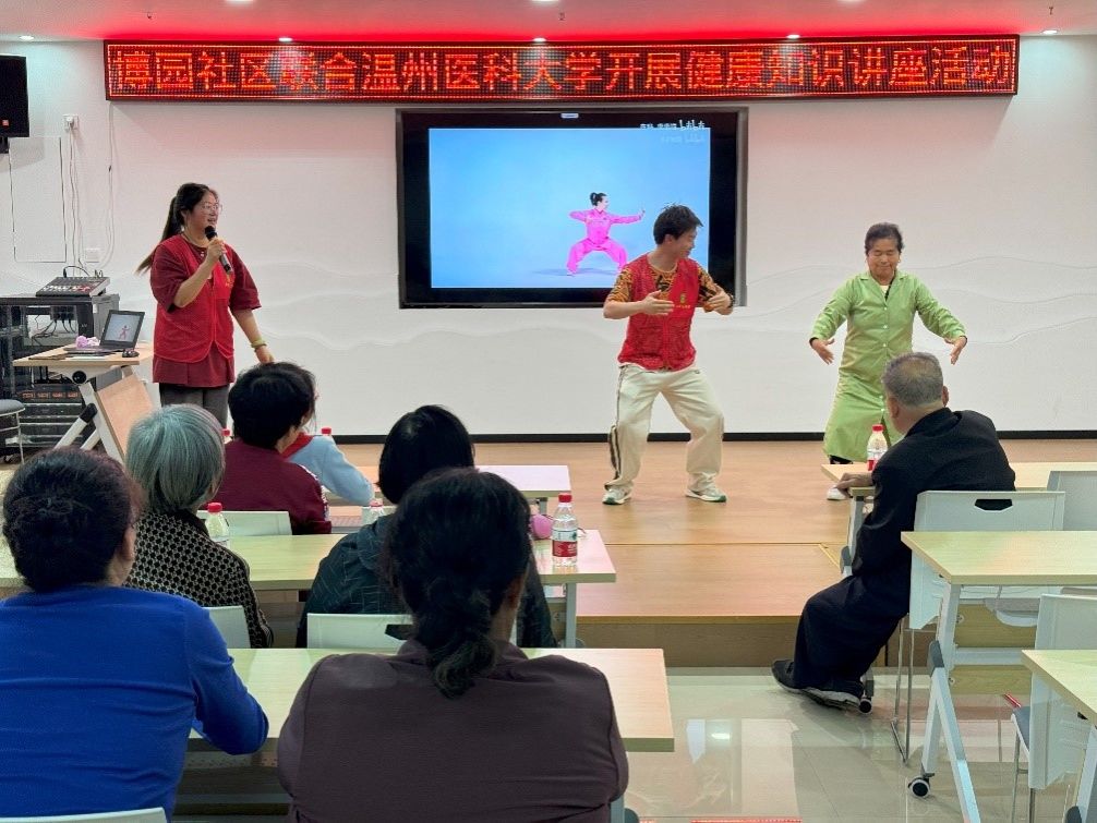 活动伊始,宣讲的同志向社区居民们介绍了膳食营养的基本知识和日常饮食的搭配方法。随后的知识抢答环节,社区居民们无论老少踊跃参与其中,积极举手回答问题,一位阿姨更是热情地分享“土豆炖牛腩”的制作方法,获得了社区居民的一致好评。随后,在“健康运动”宣讲环节中,支部同志分享了一些健康的运动方式,在普及“八段锦”这项运动时,一位阿姨更是满脸自豪地说“我天天练”,在志愿者们的鼓励下,阿姨与志愿者一同上台演示,赢得了社区居民们的热烈掌声。紧接着,宣讲同志向居民们分享了关于心理健康的知识,在问及“心情不好的时候怎么排解”时,阿姨们踊跃回答问题,表示“和小姐妹跳跳广场舞一起玩玩就好了”,阿姨们的率真简单令台下观众忍俊不禁。最后,社区居民们学习了吸烟和酗酒的危害及其预防措施,深刻认识到不良生活习惯带给身体健康的损害。