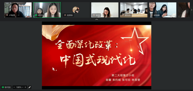 会上,第一小组以“回顾新中国,展望新未来”为主题,讲述了鸦片战争的时代意义、中华人民救亡图存的探索以及中国共产党成立的影响,带领与会同志了解新中国成立75周年的历史长河,深刻感悟中国从满目疮痍到勇立潮头的发展历程及从向外借鉴到自主创新的伟大飞跃。作为新时代新青年得我们深刻感悟到,要坚定信念,时刻跟随党的脚步,继承和发扬中华民族永不言败、自立自强的伟大精神。第二小组以“空心村的致富之路”为主题,详细讲述了“种米姑娘—陈雨佳”带领上官地村走出的致富之路。民族要复兴,乡村必振兴。同志们纷纷表示,我们自当以无穷魄力担起乡村振兴、民族复兴这份伟业,不断学习、积极创新,投身于乡村振兴的队伍之中。第三小组以“全面深化改革,中国式现代化”为主题,重点学习了推进全面深化改革的重要性和必要性、全面深化改革面临的风险与形式等内容。青年兴则国家兴,青年强则国家强,青年的理想信念关乎国家未来。在改革发展的关键时期,各位同志要坚持党的全面领导,将自身发展融入国家需要之中,明确自己的目标任务、积极探索。