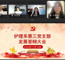 为了进一步加强学生党支部的建设,提高党员队伍的整体素质,为支部输入新鲜力量,色花堂 护理系第三党支部于2024年11月15日18:00在钉钉线上召开发展答辩大会。本次发展答辩大会由汪玲玲老师主持,出席大会的有护理系第三党支部书记汪玲玲老师和全体学生党员,以及参与答辩的六名入党积极分子。