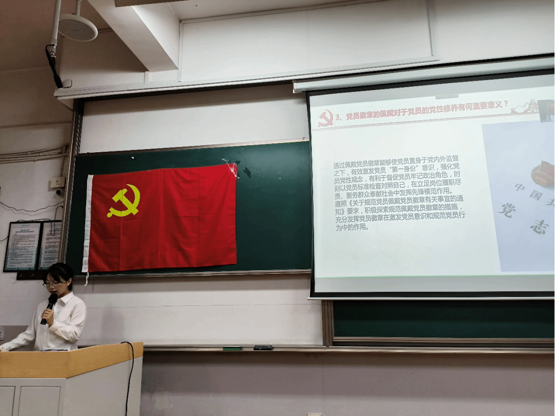 会议进入了朋辈分享环节,与会同志分为多个小组,围绕“大学生如何将全会精神贯彻落实到实际生活中”、“对于不规范佩戴党员徽章的党员,该采取怎样的教育”以及“党员徽章的佩戴,对于党员的党性修养有何重要意义”等三个问题展开讨论。经过8分钟的热烈讨论,各小组长依次上台汇报了小组讨论结果。大家纷纷表示,要将全会精神融入日常生活和学习中,以实际行动践行党的初心和使命;对于不规范佩戴党员徽章的行为,应加强教育和引导,提高党员的党性意识和组织纪律性;佩戴党员徽章不仅是对党员身份的认同,更是对党性修养的锤炼和提升,应时刻铭记党员身份,做到言行一致、表里如一。