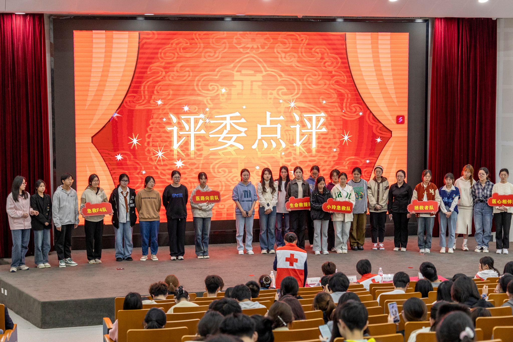 本次比赛邀请到温州市洞头区红十字会应急救护培训师郑菲菲、叶君君、唐启洁老师担任评委。现场比赛分为限时竞答、擂主争霸、即兴情景演绎三部分,其中涉及理论、实操以及结合现实情景展开救援演绎,全方位地考察参赛者的急救知识技能以及临场应变能力。经过初赛笔试激烈角逐,共有六支参赛队伍24名同学脱颖而出,进入本次决赛。