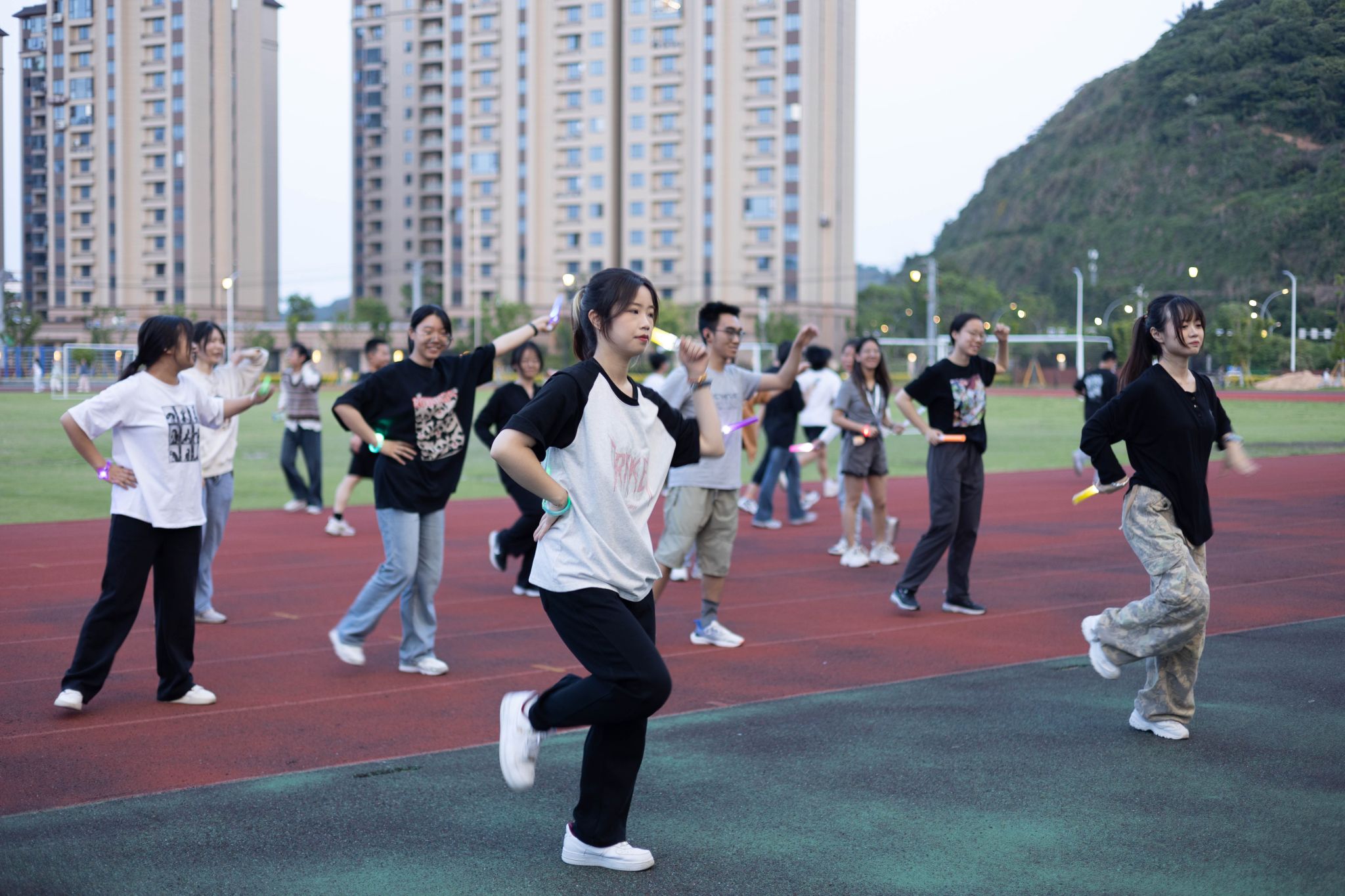 在温医大色花堂 夜晚的操场,有同学带着荧光手环,有同学挥舞着荧光棒,在动感的音乐旋律中转髋扭跨,伸腰展背。热身后同学们携手同行,跑道上点点荧光汇聚成队,鼓励和坚持在喜闻乐见的音乐和灯光下同响。此外,校园广场舞活动还邀请了学校舞蹈社同学进行歌舞表演,广场舞歌单也是紧跟潮流,现场同学跟随音乐节拍,翩翩起舞,笑容满面。不少同学表示在寝室听到操场传来的音乐,看到操场荧光点点,忍不住呼朋唤友走出寝室前往热闹的操场。