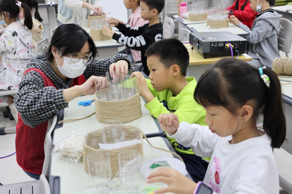 为更好的调动小朋友们保护环境的积极性,本次“乐驹学堂”的特色手工课程将带领小朋友们用矿泉水瓶制作笔筒。在志愿者耐心的指导下,小朋友们利用矿泉水瓶为基础材料,制作出了许多精美可爱的笔筒。每一个环保笔筒,既是绿色生活的表达,也是创新发明的生动体现,真正体现了“乐中学、动中学、玩中学”的教学模式。