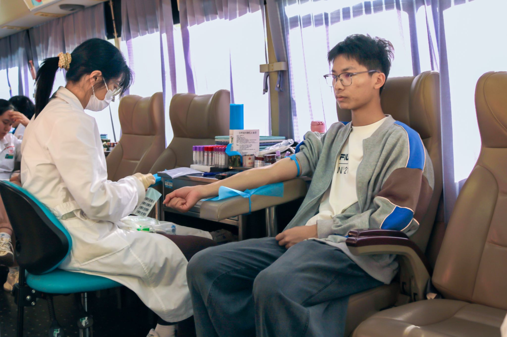 11月17日上午9时,献血车驶进滨海校区,迅速成为校园内一道亮丽的风景线,周围聚集了许多前来献血的学生,同学们热情洋溢,现场秩序井然。