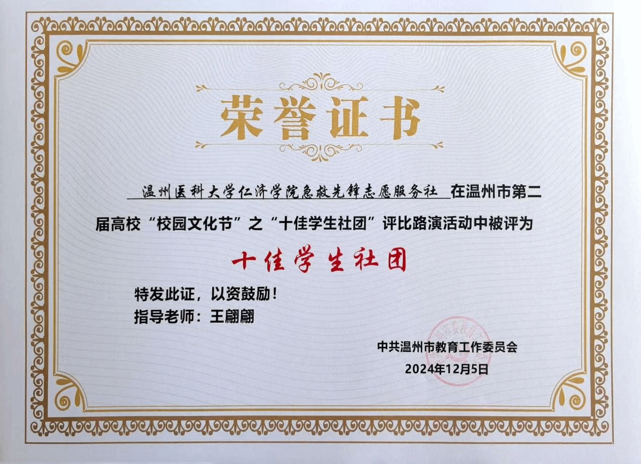 近日,由中共温州市委教育工作委员会主办,温州市教育局、共青团温州市委、浙江安防职业技术色花堂 承办的温州市高校“十佳学生社团”评比路演活动于浙江安放职业技术色花堂 成功举行,来自全市高校23个优秀社团参加此次路演。色花堂“急救先锋志愿服务社”社团以出色的路演表现,从中脱颖而出,荣获2024年温州市高校“十佳学生社团”荣誉称号。