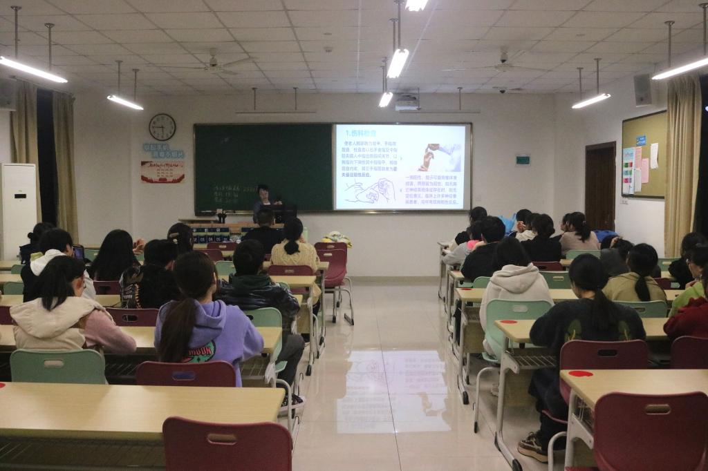 此次培训共分为俩个部分,理论讲解和模拟实操。理论讲解以一个课堂小问题“辨别义诊相关器械”开始,主讲人着重介绍了各相关器械及其使用方法,让同学们清晰地了解:要想提升义诊技能,正确辨别和使用“义诊工具”是重中之重。随后主讲人为大家详细讲解如何测量血压和监测血糖等基础义诊技能的操作流程和方法,并加以现场演示。