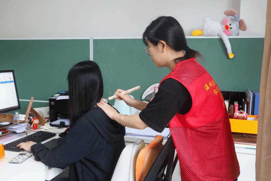 5月28日,教师艾灸按摩活动如约开展。志愿者们身着志愿服,手持艾灸棒,分组前往各教师办公室。志愿者们以娴熟的手法,为教师们进行按摩艾灸。教师们在这温馨的氛围中,放松身心,感受着这独特的节日关怀。