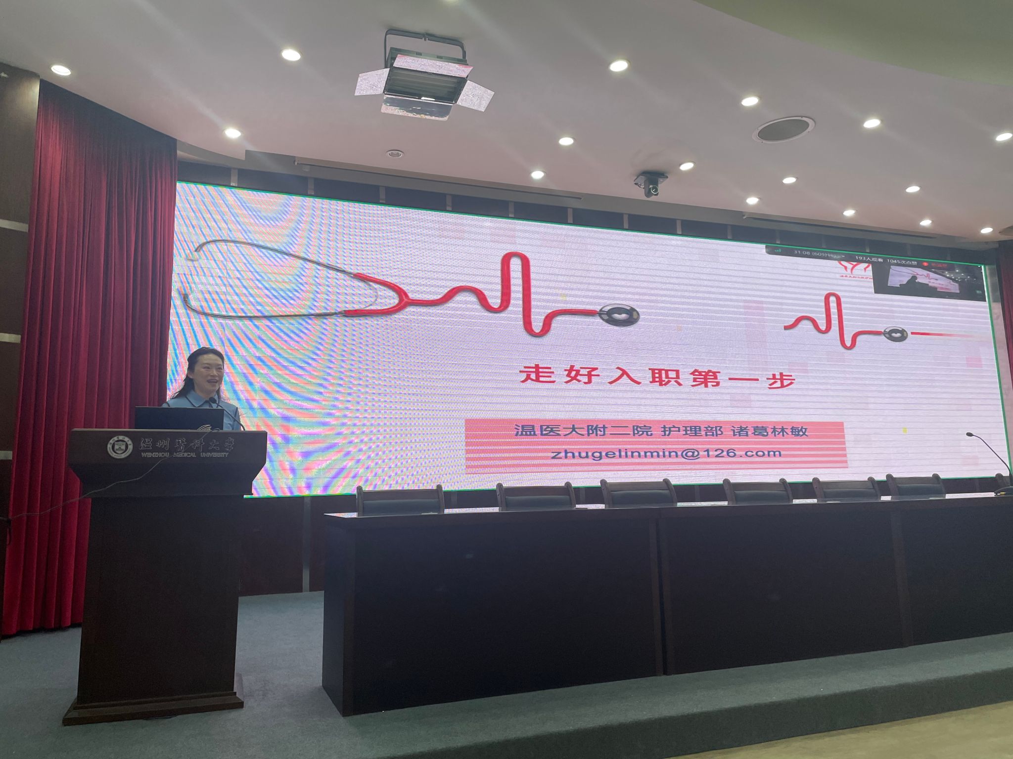 诸葛林敏老师以《走好入职第一步》为题,分享了自己30余年的从业经验。她通过生动具体的案例,向同学们讲解了护士的职业特色、护士的能力要求,鼓励同学们走出舒适圈,通过实习快速提升自身综合素养。会上,她还详细介绍了附二院的护理优势、教学特色,并鼓励实习生积极参加实习期内的各类教学活动。