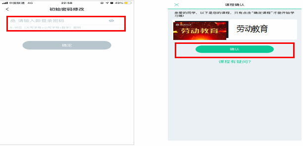 未登录过的同学在学号登录、验证姓氏、绑定手机号、修改初始密码后,会弹出课程确认的界面,点击确认即可。