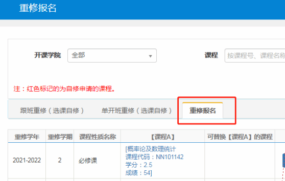 (二)因学籍异动留降级的学生,原考核不合格的课程,若所在班级有正常开课,可不用报名重修,直接跟降级后的班级正常修读;所在班级未开设的课程,则仍需报名重修。本学期面临学业预警降级但还未降级处理的同学,不合格的课程也按规定报名重修,以免错过重修安排。