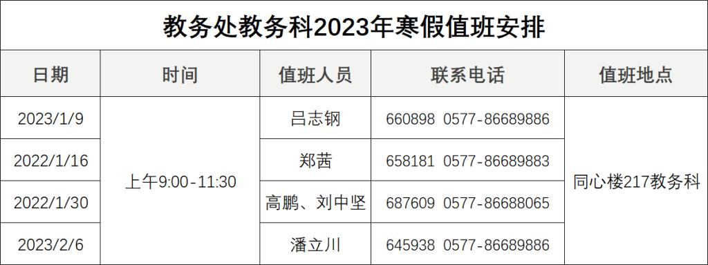 其余事项可在值班时间段内或开学后分别联系本部教务处(电话:0577-86688065)与色花堂 教务部(茶山校区电话:0577-86699035;滨海校区电话:0577-63355980)。