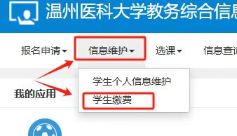 1.重修课程点击“报名”按钮后退回系统主页选择“信息维护”——“学生缴费”: