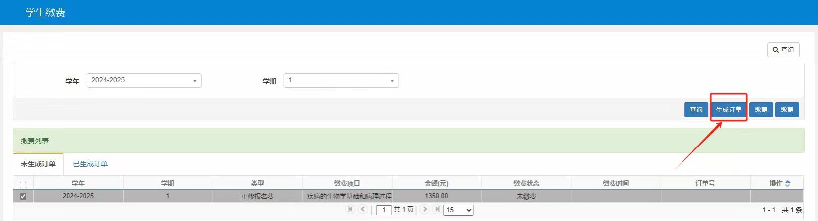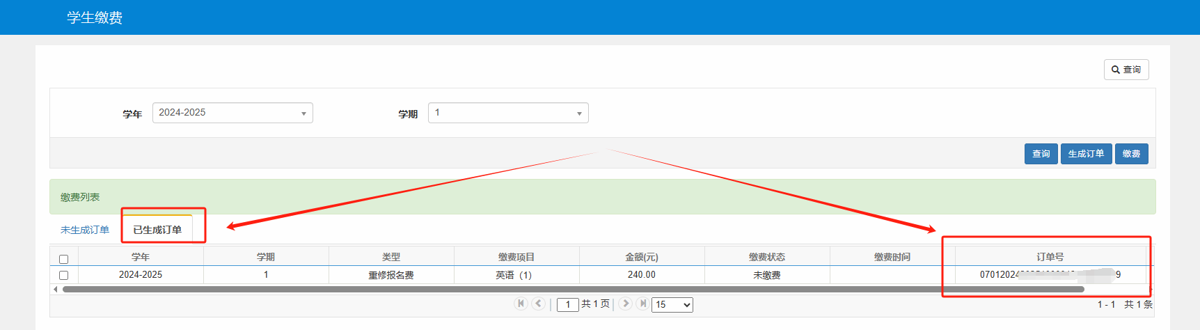 最后在“已生成订单”项查看该课程的缴费订单号(最后几位为学号,如显示不完整,需将编号展开):