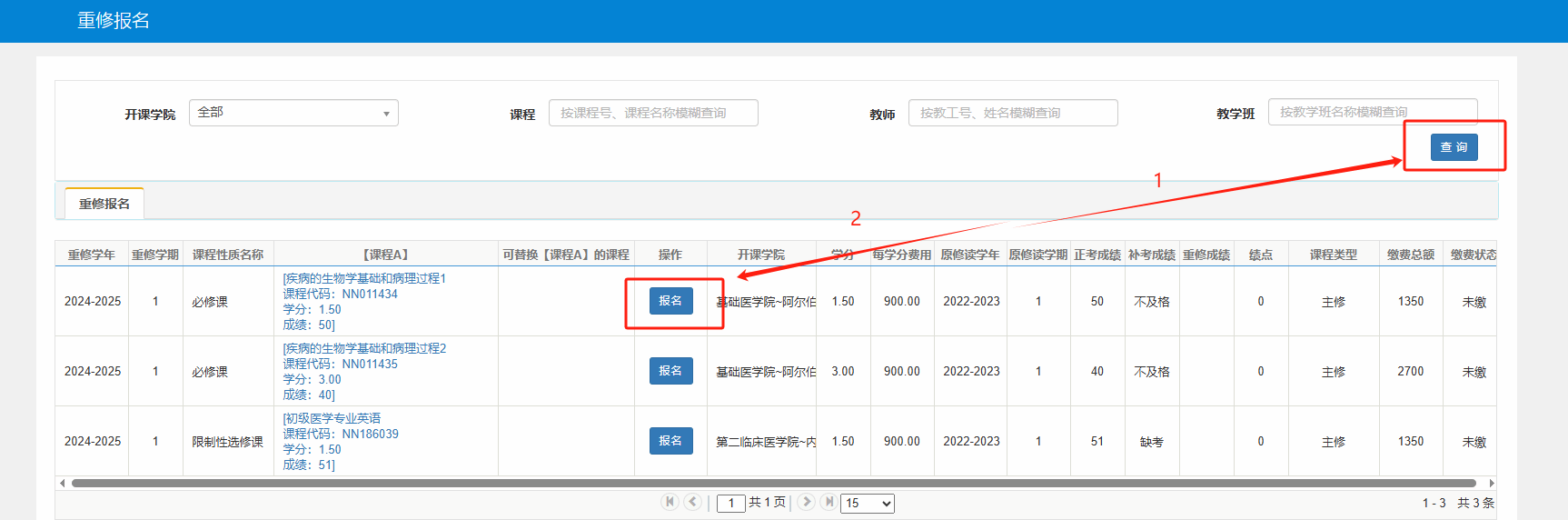通过查询课程代码或名称(成绩查询界面查看即可)找到自己要报名的课程,在该课程最右边点击“报名”,重修考试时间默认为“期末考”,如遇重修课程考试和正考时间冲突,需携带重修通知单在规定时间内到教务处将考试时间变更为下学期期初考试,具体期末重修改期初事宜另行通知。报名后可以点击右侧黄色长条框“重修报名信息”查看已选课程。报名期间如要退选课程,必须在缴费前点击已选课程右边红色“退选”按钮进行退选