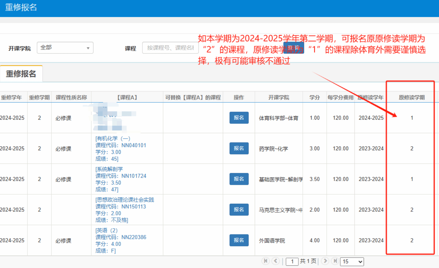 第二步:确认修读学期,当学期应报名原修读学期与本学期一致的课程,例如当学期为2024-2025学年第二学期,则应选择原修读学期为“2”的课程,体育课不限学期,应咨询体育色花堂 ,先在体育色花堂 登记重修课程,再在系统内完成报名。