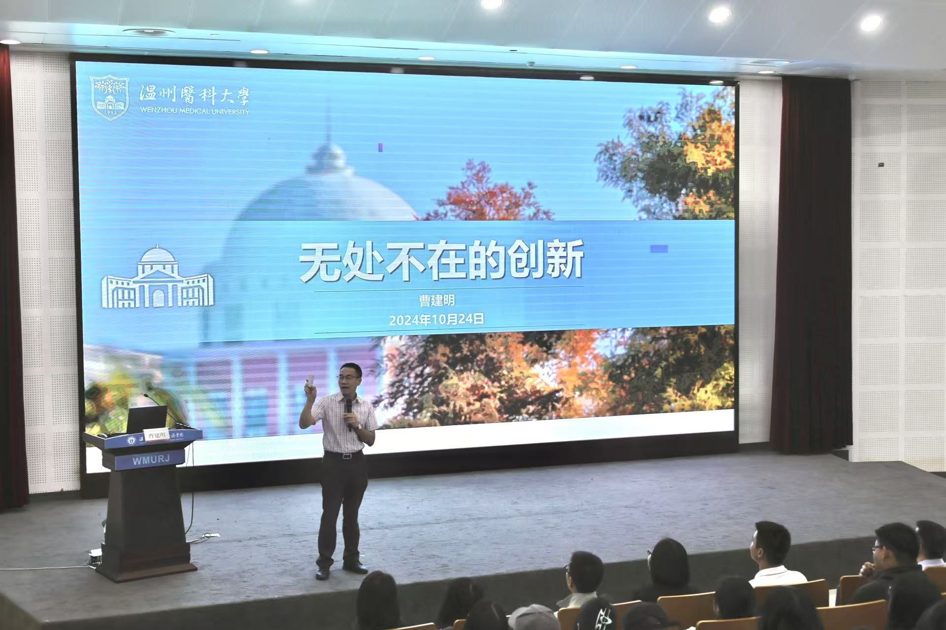 然后,是曹建明教授所作的演讲“无处不在的创新”。曹教授用风趣的语言介绍了他对于创新的独到见解,在演讲中,曹教授通过其过往的创新成果包括除菌喷雾,皮革保护剂,新式标本防腐剂的创新流程回顾,引导开阔同学们对于创新的理解,促使同学们仔细思考创新的方式。曹教授的演讲让我们感受到了同学们的创新创业可以从生活细节的改变出发,改变了大家以往对于创新的刻板理解,明晰了同学们未来创新的可行之路。