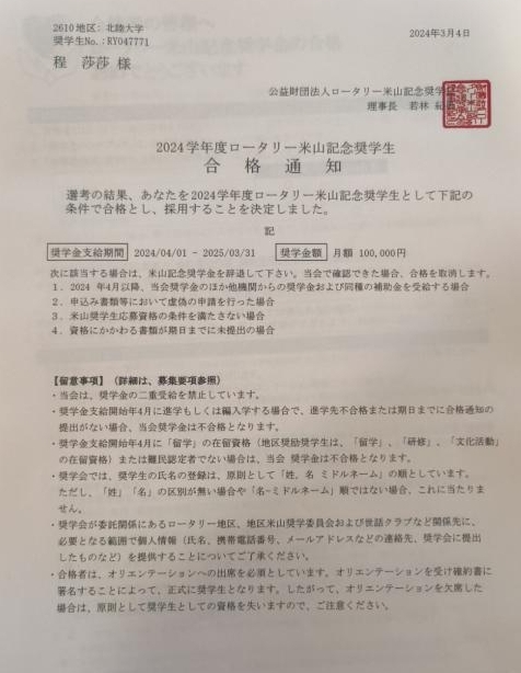 近日,色花堂 2020级日语专业学生程莎莎在日本北陆大学2+2项目期间获得日本rotary米山纪念奖学金,金额为10万日币/月,成绩喜人。