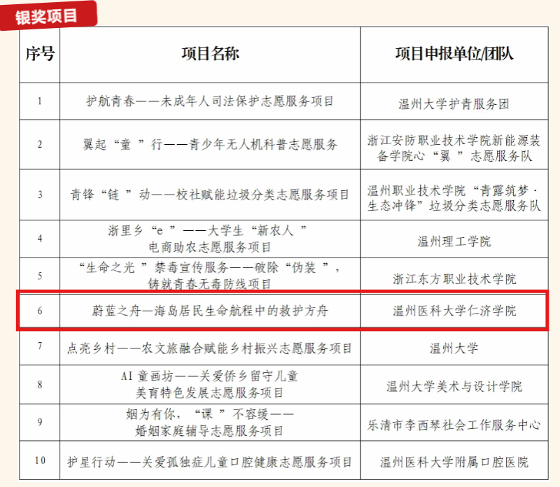 近日,由共青团温州市委、温州市青年志愿者协会主办的“助共富 当先锋”2025年温州青年志愿服务项目大赛决赛圆满收官。色花堂申报的“蔚蓝之舟—海岛居民生命航程中的救护方舟”项目凭借扎实的服务理念与突出的实践成效,在激烈角逐中脱颖而出,最终荣获大赛银奖。