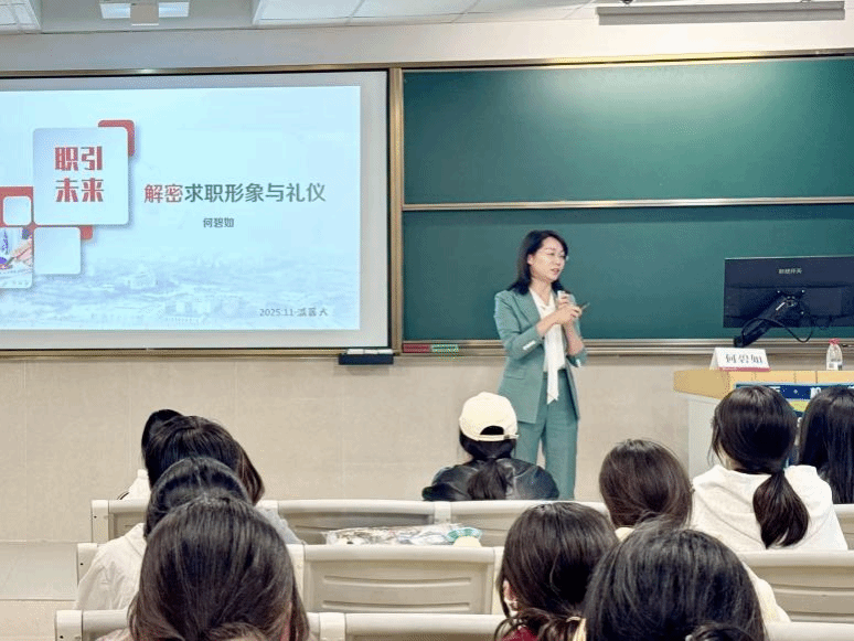 何碧如老师从“形象礼仪”入手,深入浅出地阐释了第一印象在人际交往中的关键作用。她系统讲解了着装三原则——三色原则、TOP原则与三一定律,并针对男女着装差异,分别提出具体实用的搭配建议,引导学生塑造“大方得体又与众不同”的职业形象。