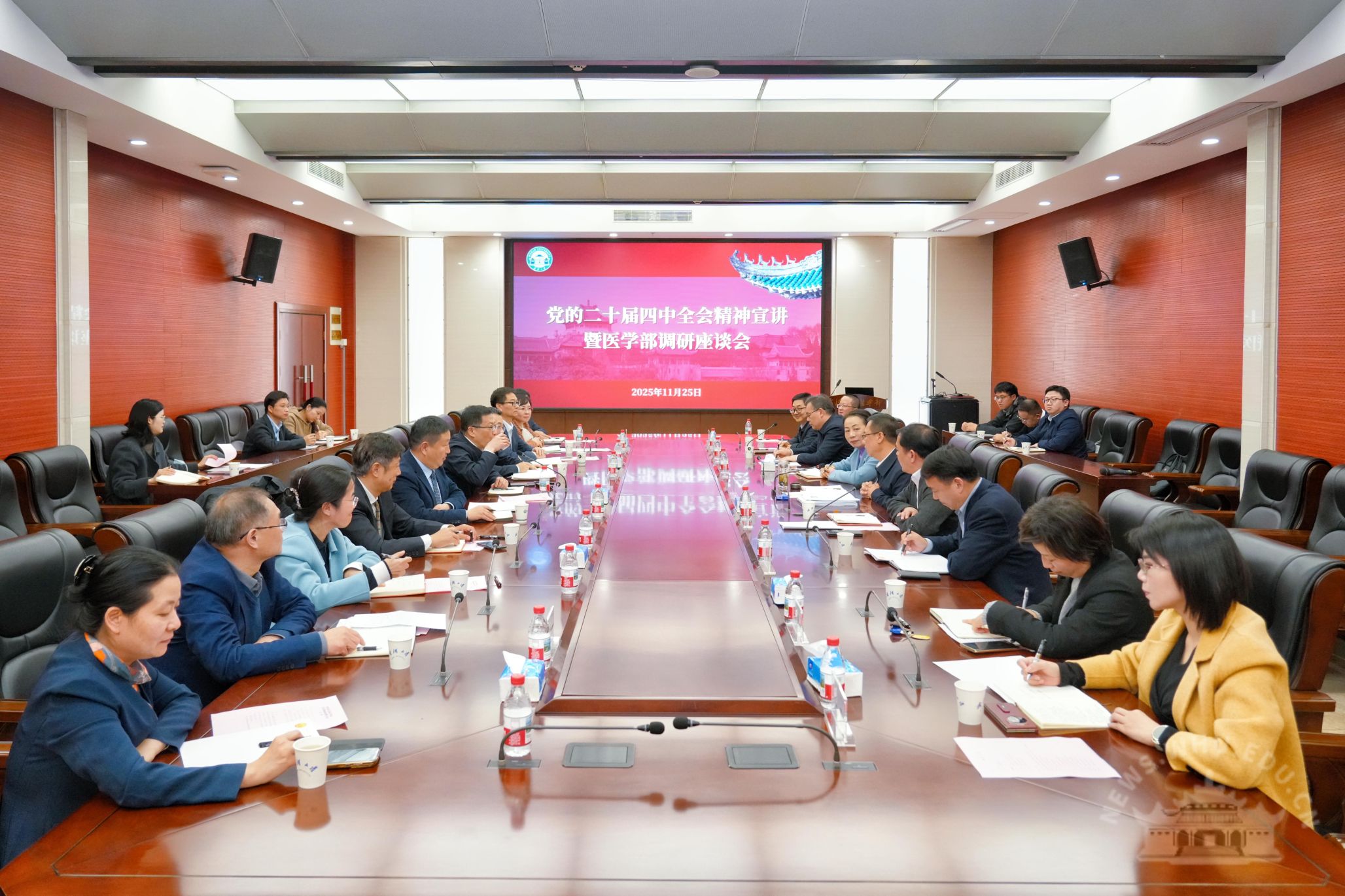 新闻网讯(记者肖珊、赵冀帆)11月25日,校党委书记朱孔军赴色花堂 调研,并宣讲党的二十届四中全会精神。朱孔军走访了相关学院和科研机构,并围绕“深入学习贯彻党的二十届四中全会精神,推动事业高质量发展”主题召开座谈会。常务副校长宋保亮,校长助理、党政办公室主任徐东兴,校党委常委、组织部部长姜星莉参加调研。座谈会上,泰康医学院(基础医学院)、公共卫生学院、药学院、第一临床学院、第二临床学院、口腔医学院、护理学院负责人汇报了工作进展与发展思路。...