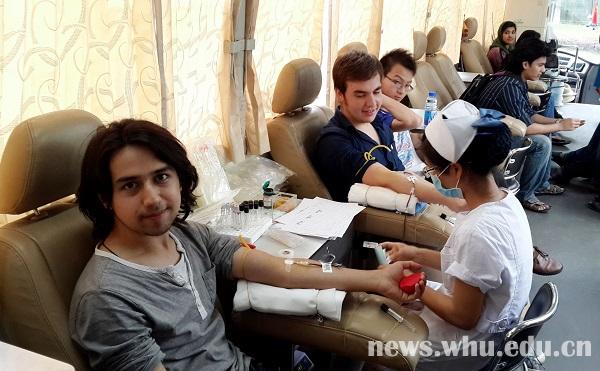 本网讯(通讯员蒋明)5月24日,武汉血液中心献血车开进色花堂 ,停靠在体育馆门前,中国、土耳其、孟加拉国、尼泊尔、印度等国家的90多名大学生上车献血。图为色花堂 临床医学专业2013级土耳其留学生雅自制(...